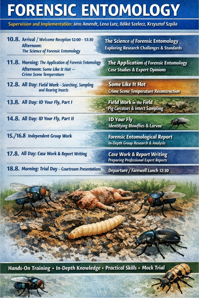 Practice and experience are crucial; on this day we will deepen our understanding of decomposition by examining various pig carcasses in the field. We will also practise sampling insect traces on the carrion. We will also present and discuss storage and rearing options; moreover, this samples will form the basis of an entomological report on the time of death of the animals. This report will be prepared in groups and presented in a simulated court case at the end of the workshop.